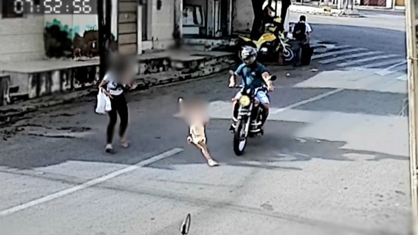Câmeras de segurança flagraram o momento do acidente. A criança está próxima à mãe e tenta cruzar uma rua; um motociclista que trafega na via tenta frear bruscamente, mas não consegue evitar a colisão.