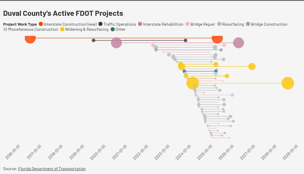 O Departamento de Transporte da Flórida lista 43 contratos ativos no Condado de Duval. Eles cobrem tudo, desde o ressurgimento da estrada até a construção da ponte e estão em vários palcos no processo. O projeto ativo mais antigo, O intercâmbio North I-95/I-295começou há nove anos atrás. Até agora, custou mais de US $ 191 milhões. (Isso está acima do orçamento). O FDOT espera encerrar esse projeto no próximo mês.