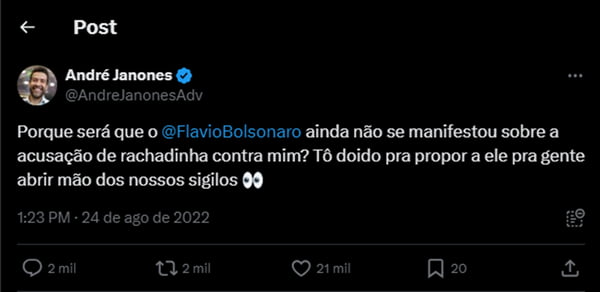 O deputado federal André Janones (Avante-MG), que confessou ter cometido crime de rachadinha no próprio gabinete, já atacou bolsonaristas pela prática. Isso ocorreu porque o senador Flávio Bolsonaro (PL-RJ) já foi acusado de desviar parte do salário de assessores quando era deputado estadual.