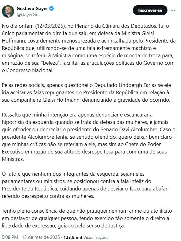 O deputado também afirmou que o presidente teria oferecido a ministra a Alcolumbre e ao presidente da Câmara, Hugo Motta (Republicanos-PB), “como um cafetão oferece uma garota de programa“. Em outra publicação, Gayer também disse que imaginou um trisal envolvendo Gleisi, Motta e Alcolumbre.