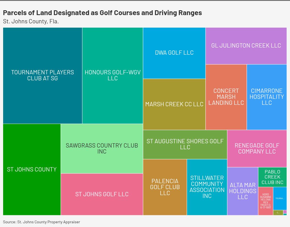 A semana do campeonato de jogadores é um lembrete tão grande quanto de que o golfe é um grandes negócios na primeira costa. Nosso número da semana é a quantidade de terras que os campos de golfe e as faixas de direção ocupam no Condado de St. Johns: 3.450,85 acres, de acordo com os registros do avaliador de propriedades.