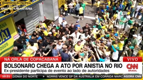 O ex-presidente Jair Bolsonaro (PL) chegou à orla da praia de Copacabana, no Rio de Janeiro, neste domingo (15), para participar do ato em defesa da anistia para envolvidos no 8 de janeiro.