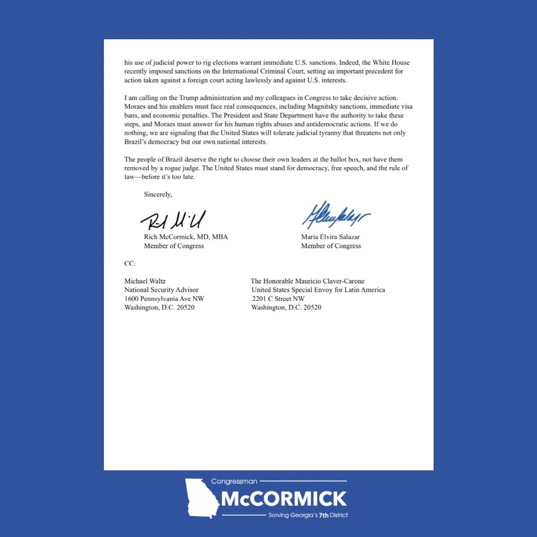Na publicação em suas redes sociais, McCormick incentivou outros membros do Congresso e do Senado americano a assinarem a carta “em defesa da liberdade nesta nação criticamente importante”.