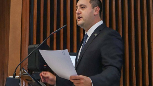 Um homem em um terno escuro está falando em um microfone, segurando papéis em uma mão. Ele está em um ambiente formal com painéis de madeira ao fundo. O homem parece estar em um momento de discurso ou apresentação.
