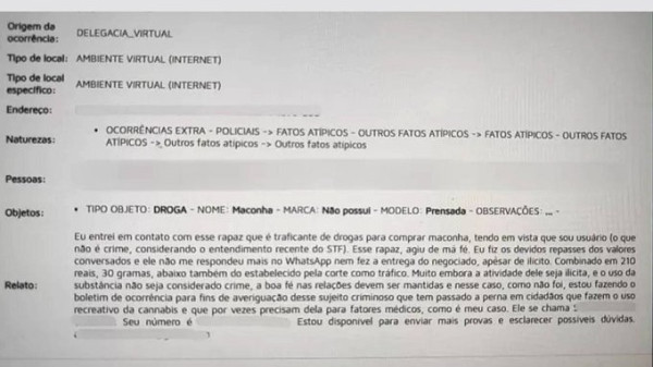 No BO, o homem afirma que fez um contato via WhatsApp com o vendedor e combinou a compra da droga por R$ 210. Após realizar o pagamento, o homem não teria respondido mais às mensagens e não fez a entrega.