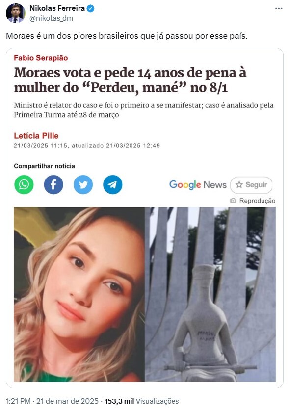 O deputado federal Nikolas Ferreira (PL-MG) compartilhou uma reportagem em suas redes sociais, nesta sexta-feira (21), sobre uma decisão do ministro Alexandre de Moraes, do Supremo Tribunal Federal (STF), que defendeu 14 anos de prisão à mulher que escreveu “perdeu, mané” na estátua da Justiça, no famigerado 8 de janeiro de 2023.