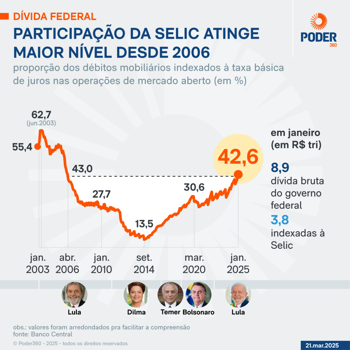 A parcela da dívida mobiliária federal atrelada à Selic atingiu 42,6% no acumulado até janeiro de 2025. Esse é o maior patamar de participação da taxa básica de juros no endividamento público desde abril de 2006, quando era de 43,0%.