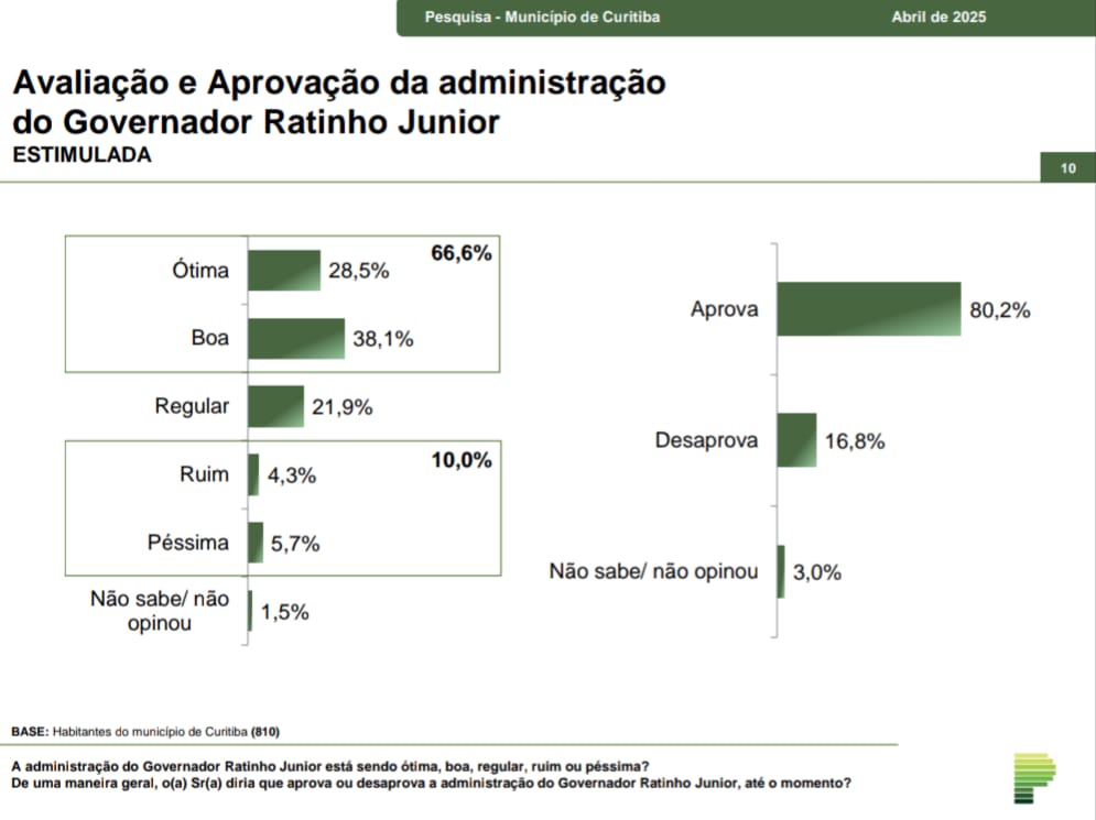 Nesse levantamento que aponta a avaliação que os eleitores fazem dos seus governantes, o governador Ratinho Junior (PSD) merece a aprovação de 80% dos entrevistados, enquanto 81% aprovam a gestão do prefeito de Curitiba, Eduardo Pimentel (PSD).