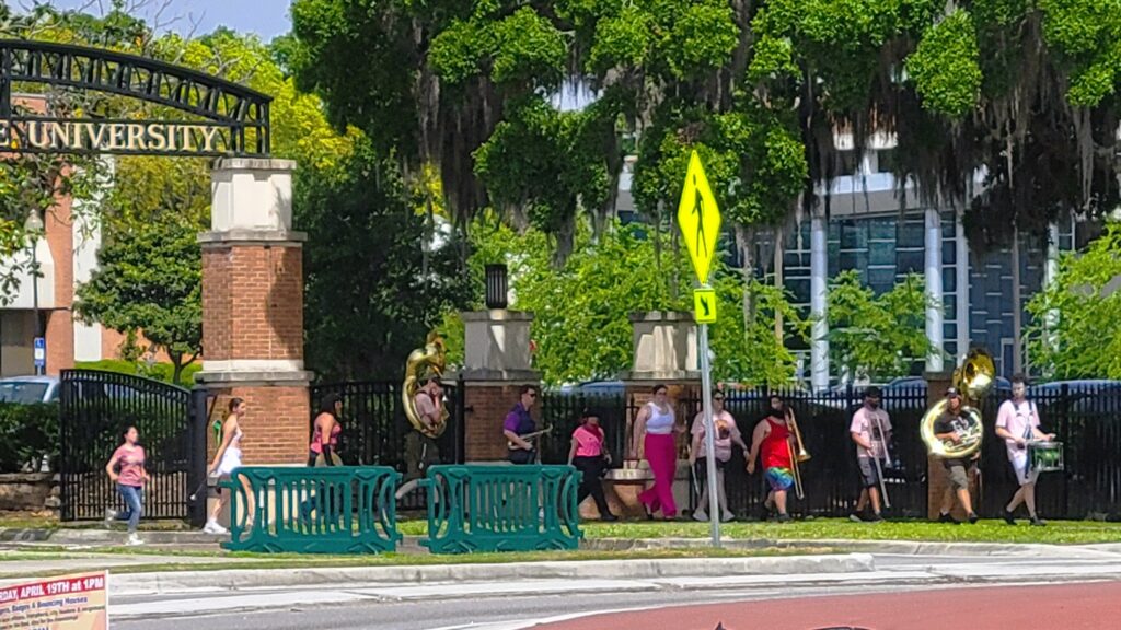 Os instrumentos de metais brilhavam no sol na terça -feira, quando a atual banda atlética RIP da Universidade de Jacksonville continuou a protestar contra a perda de programas de música e teatro da universidade particular.