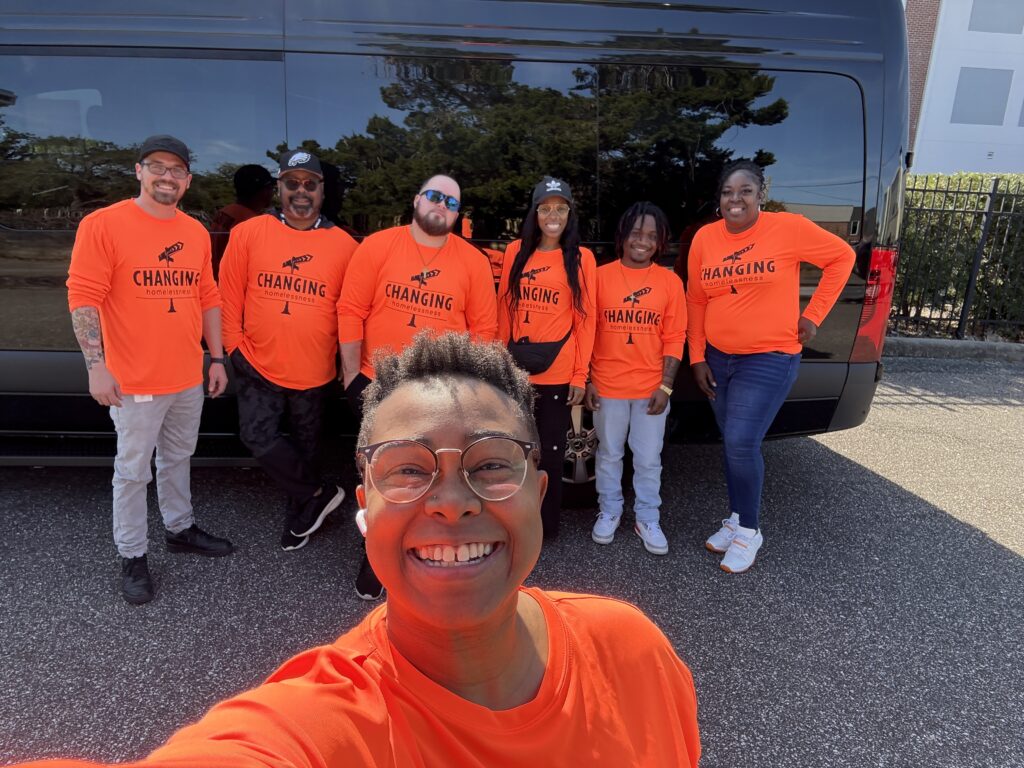 O líder da equipe, Shardae Bellamy, tira uma foto com os outros na equipe de divulgação de sem -teto em Jacksonville. | Foto mudando de sem -teto