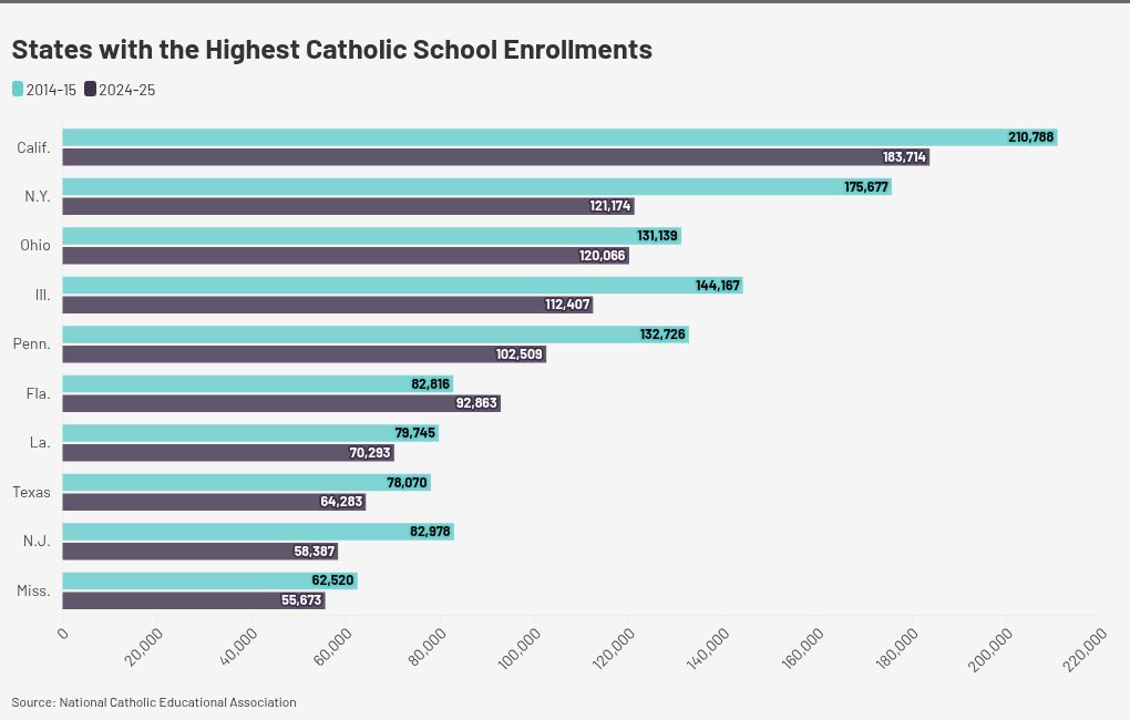 Isso significa que o estado viu um aumento ao mesmo tempo em que as escolas católicas em todo o país tiveram uma queda de 13,2%, de acordo com a Associação Nacional de Educação Católica. Antesendo os estudantes, o fornecedor do programa de cupons da Flórida, chamado de amor de destaque da Flórida pelas escolas católicas de “uma linha de tendência especialmente incrível” em um e-mail recente para os pais dos destinatários.