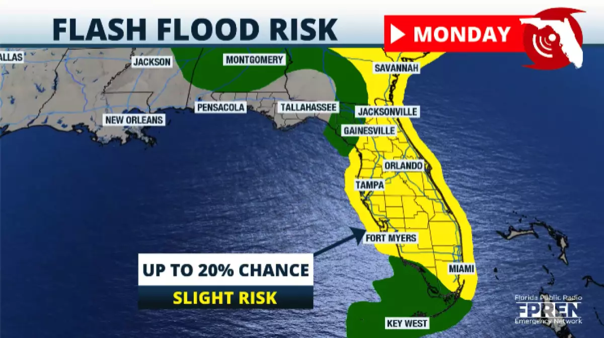 O período mais perigoso para o sudeste da Flórida será entre 9h e 15h, as chuvas torrenciais provavelmente cairão em áreas altamente povoadas, produzindo inundações repentinas.