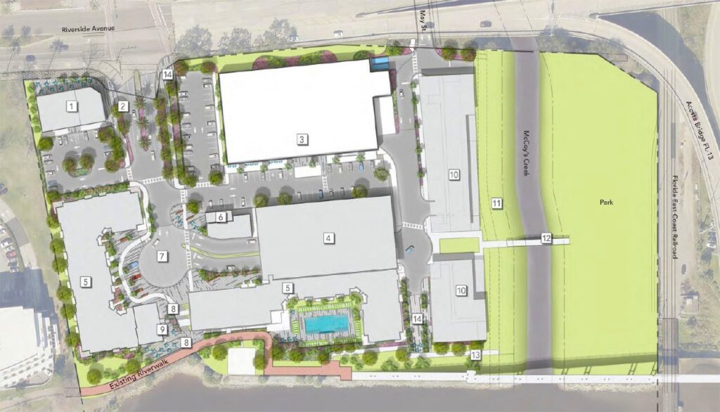 O Riverwalk e uma ponte de pedestres foram removidos como parte da cidade Projeto de restauração de McCoy Creek. Isso inclui reconstruir o canal da Leland Street para a Interstate 95, bem como da rua de May ao Rio St. Johns, tudo para resolver inundações durante fortes chuvas.
