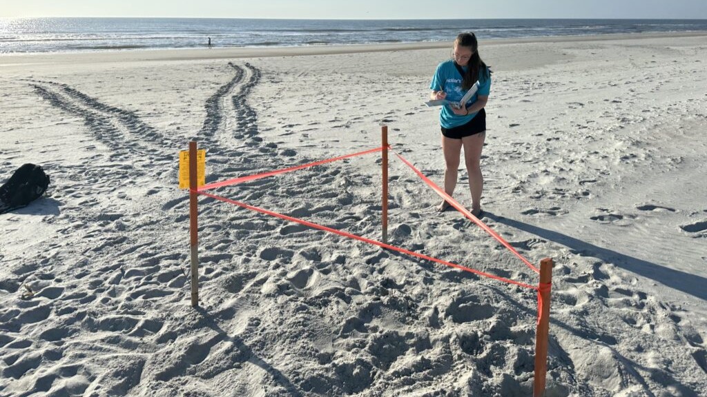 Ao longo de um trecho de quase 5 quilômetros de Ponte Vedra Beach, do Sawgrass Beach Club até a Reserva Nacional de Pesquisa Estuarina de Guana Tolomato Matanzas, os ninhos de tartarugas são verificados diariamente de meados de abril a outubro. Fazendo o monitoramento são estudantes como Emily Hoeflich, uma estudante de mestrado que faz parte do novo programa da JU com seis alunos.