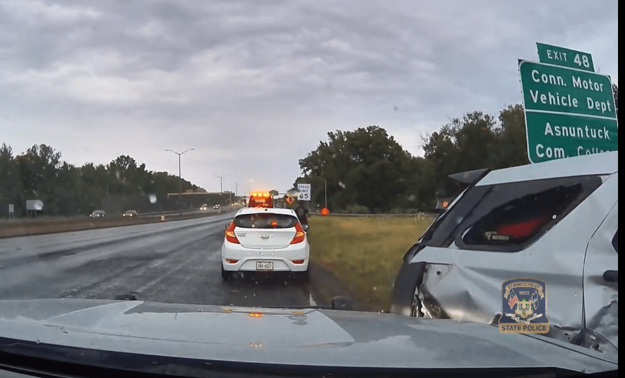 A polícia estadual disse que o motorista de 18 anos de Waterbury estava viajando pela pista esquerda quando dirigia pela água parada e perdeu o controle, girando em três faixas antes de atingir o fundo de um dos veículos da polícia que estava estacionado no ombro. O primeiro veículo policial foi empurrado para o outro.