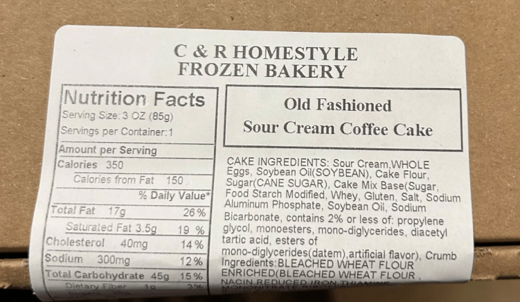 HARTFORD, Connecticut (WTNH)-A divisão de alimentos e padrões do Departamento de Proteção ao Consumidor de Connecticut (DCP) anunciou na terça-feira que a empresa de padaria de Danbury, C+R, está lembrando seus bolos de café à moda antiga congelada devido a leite não declarado.