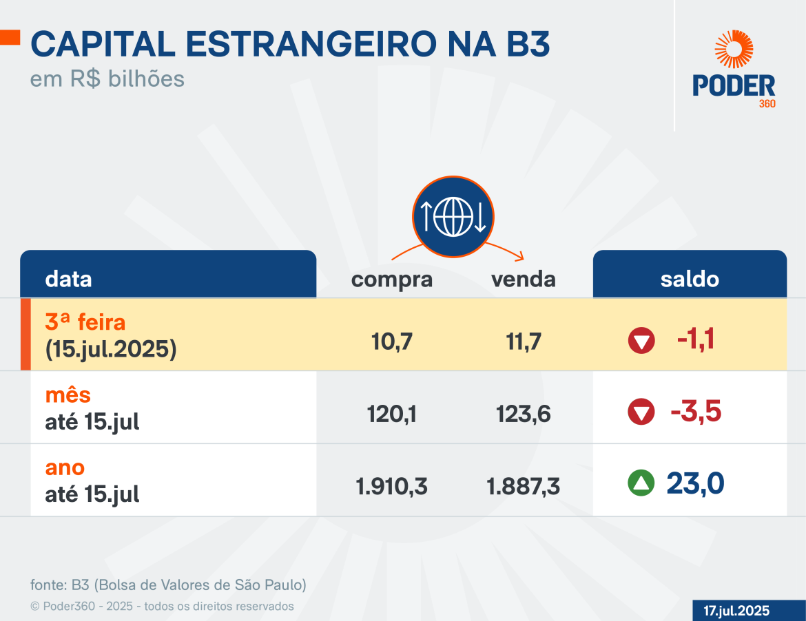Os investidores estrangeiros retiraram R$ 3,5 bilhões da B3 (Bolsa de Valores de São Paulo) na parcial de julho de 2025. Na 3ª feira (15.jul.2025), o último dado diário disponível, houve saída líquida de R$ 1,1 bilhão do mercado de ações.