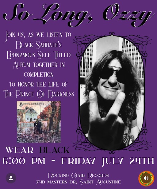 Rasgue para o príncipe da escuridão. As pessoas estão se reunindo em Rocking Chair Records Para tocar o primeiro álbum do Black Sabbath – iniciar o fim – na honra de Ozzy Osbourne. Depois, compartilhe histórias de Ozzy, memórias e possivelmente algumas lágrimas com fãs que pensam da mesma forma. Transas fúnebres negras encorajadas.