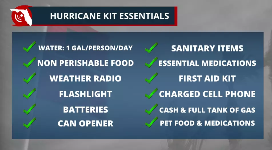 A lista inclui itens essenciais como baterias (AA, AAA, C, D, 6 volts e 9 volts), detectores de monóxido de carbono, geradores portáteis, lonas e latas de gás portáteis. Itens alimentares não perecíveis, água engarrafada e higiene comum e itens pessoais de saúde que são adições comuns aos kits de prontidão para desastres já são categorizados como não proxágios pelo Departamento de Receita da Flórida.