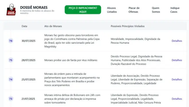 O Dossiê Moraes apresenta uma linha do tempo com os atos do ministro que, segundo seus organizadores, configuram crimes de responsabilidade à luz da Lei 1.079/1950, que trata do impeachment de autoridades. Entre os casos listados estão desde a recente polêmica envolvendo um gesto obsceno feito por Moraes durante um jogo de futebol até a instauração do inquérito das fake news, em 2019.