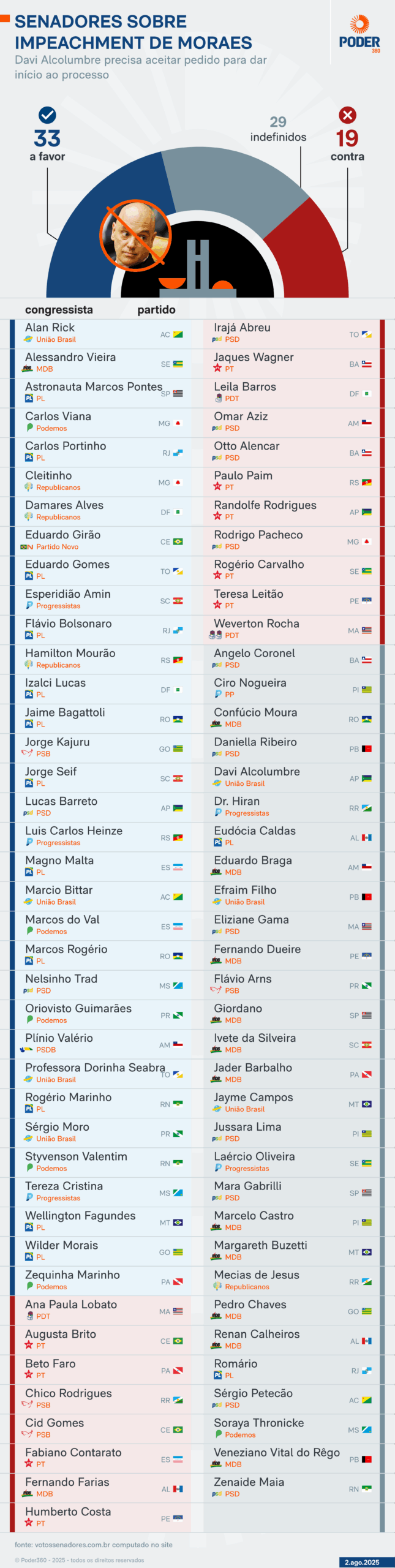 Os dados, do site “votossenadores.com.br”, mostram que 34 senadores são a favor do impeachment e 19 são contra. Há ainda outros 28 indefinidos. Vanderlan Cardoso (PSD-GO) aparece como um dos votos favoráveis. Porém, pediu licença do cargo em 1º de julho e Pedro Chaves (MDB-GO) assumiu a vaga. Para a contagem realizada pelo Poder360, o suplente foi incluído entre os indefinidos.