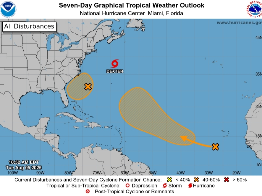 Enquanto Dexter continua sua caminhada no nordeste pelo Oceano Atlântico com ventos máximos sustentados de 40 mph, litoral do norte da Carolina do Norte, Virgínia, Delaware e Maryland, correm um alto risco de correntes de RIP na terça e quarta -feira, O Centro Nacional de Furacão disse.