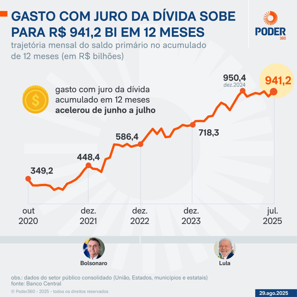 Em 12 meses, a despesa com juros da dívida totalizou R$ 941,2 bilhões, o que corresponde a 7,64% do PIB (Produto Interno Bruto). Havia sido de R$ 869,8 bilhões nos 12 meses até julho de 2024.