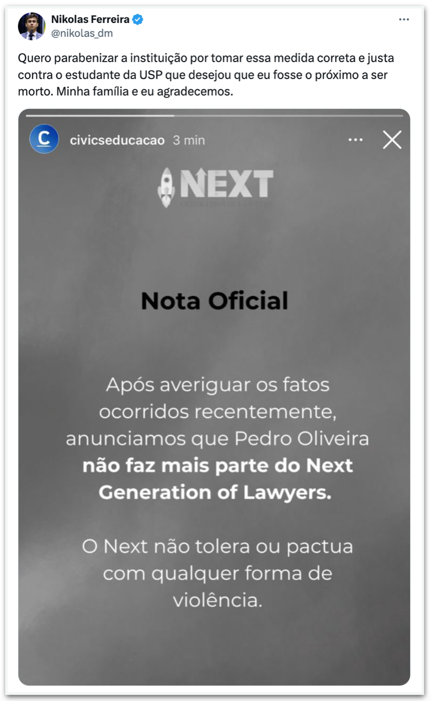 O estudante de direito Pedro Bala foi demitido nesta 5ª feira (11.set.2025) da empresa em que trabalhava, a Next Generation of Lawyers, depois de publicar nas redes sociais uma mensagem em tom de ameaça em que indica torcer pela morte do deputado federal Nikolas Ferreira (PL-MG).