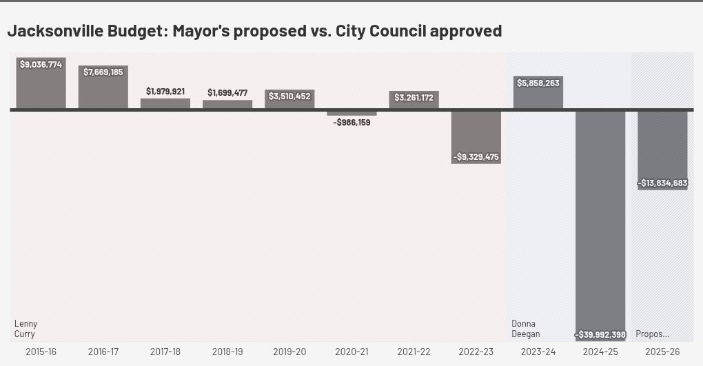 Jacksonville hoje Demorou na última década nas propostas de orçamento de Deegan, um democrata e seu antecessor republicano, a prefeita Lenny Curry. Uma aparência de alto nível mostra que, em seu terceiro ano no cargo, o conselho se afastou mais com o orçamento de Deegan do que os conselhos anteriores com a de Curry.