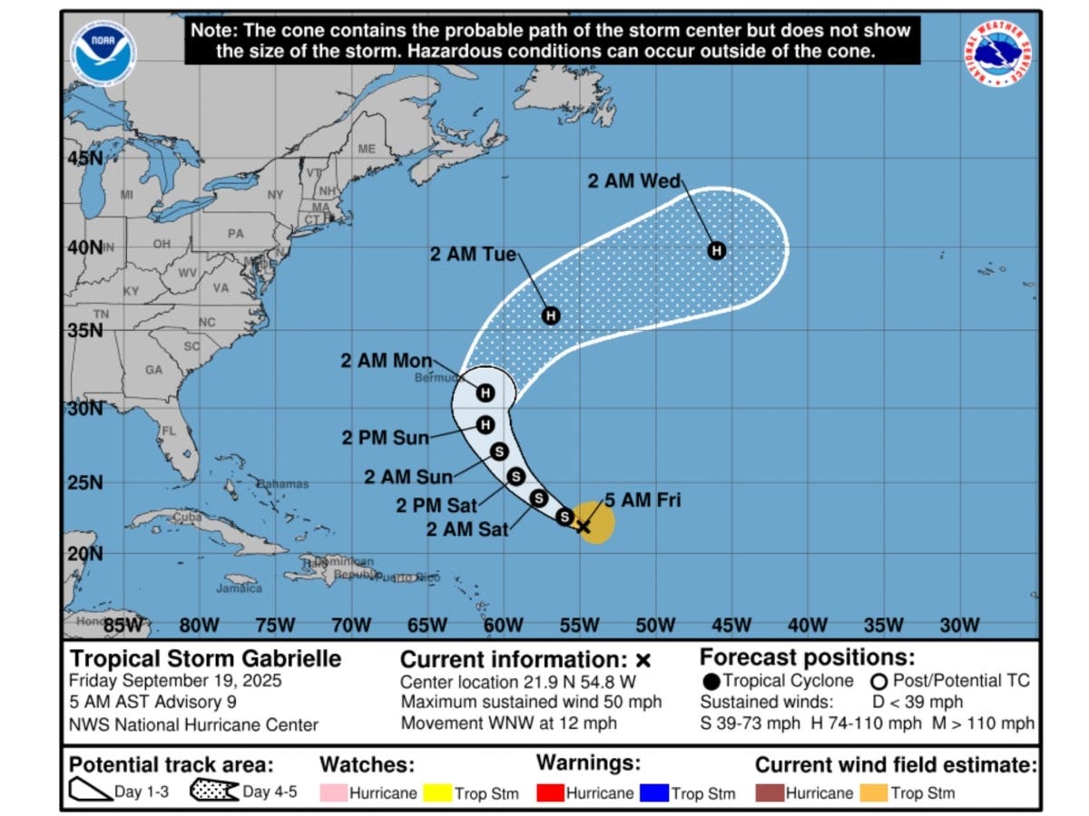 O Centro Nacional de Hurricane originalmente prevê que Gabrielle poderia atingir o status de furacão por volta das 2 da manhã de segunda -feira. No entanto, por volta das 5 da manhã de sexta -feira, o NHC disse que a tempestade pode se transformar em um furacão até domingo.
