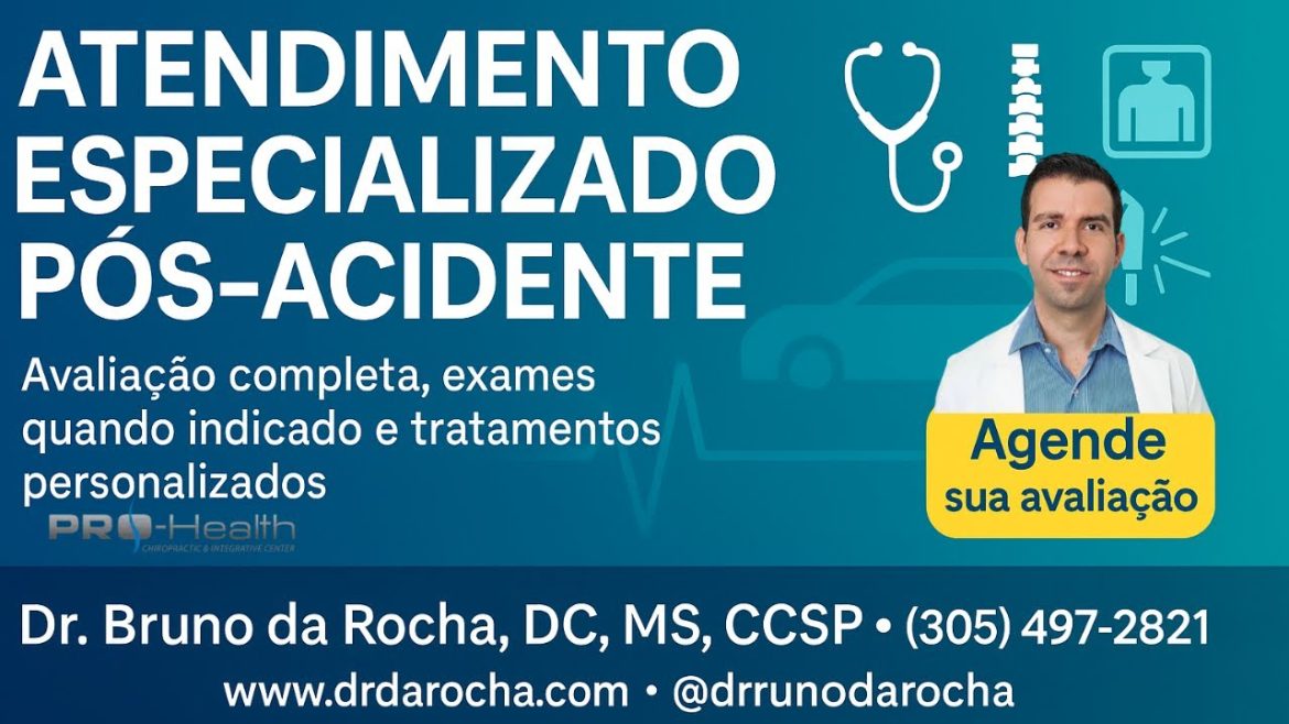 Após um acidente de carro, uma avaliação especializada faz toda a diferença. O Dr. Bruno da Rocha (DC, MS, CCSP, ICSC) oferece atendimento pós-acidente com testes ortopédicos e neurológicos, encaminhamento para exames de imagem quando indicado e tratamentos personalizados: Quiropraxia, Spinal Decompression, Shockwave e Laser Therapy.