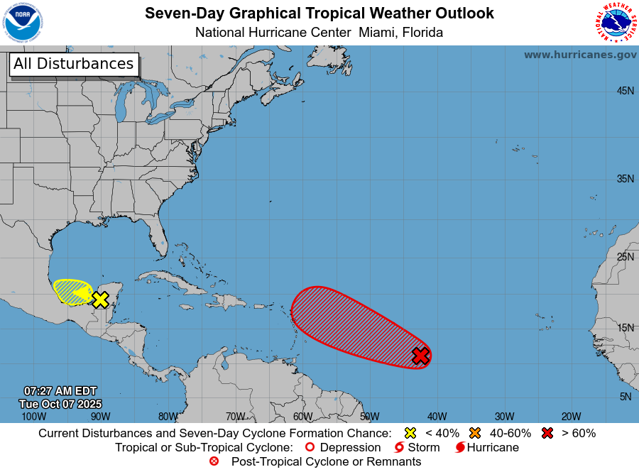 Há também uma área de que os meteorologistas estão de olho no sudoeste do Golfo, que tem 10 % de chance de se desenvolver antes de se mudar para o interior do sul do México na quarta -feira ou no início da quinta -feira.