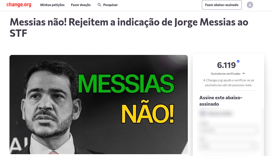 Um abaixo-assinado contra a indicação de Jorge Messias ao Supremo Tribunal Federal (STF) já reúne mais de 6 mil assinaturas. A iniciativa é da entidade União pela Liberdade de Expressão (FSU-BR) e pede que o Senado rejeite o nome do atual advogado-geral da União.