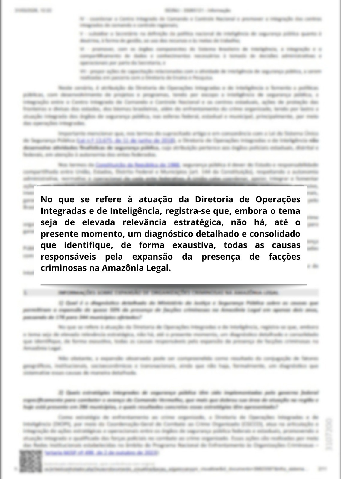 “Embora o tema seja de elevada relevância estratégica, não há, até o presente momento, um diagnóstico detalhado e consolidado que identifique, de forma exaustiva, todas as causas responsáveis pela expansão da presença de facções criminosas na Amazônia Legal”, afirmou o ministério.
