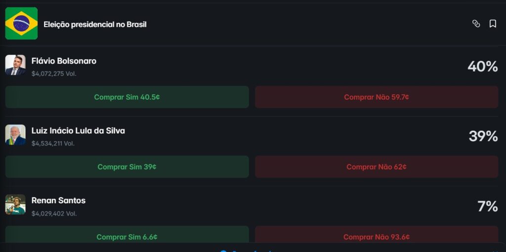 A Polymarket é uma plataforma internacional de mercado de previsões em que usuários negociam contratos com dinheiro real sobre eventos futuros, geralmente por meio de criptomoedas. No caso das eleições, os participantes compram e vendem posições vinculadas aos resultados políticos.