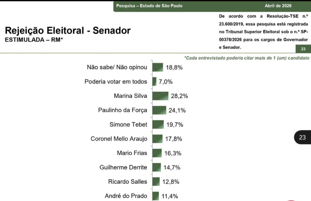 No recorte de rejeição, Marina lidera com 28,2%. Na sequência estão Paulinho (24,1%), Tebet (19,7%), Coronel Araújo (17,8%), Frias (16,3%), Derrite (14,7%), Salles (12,8%) e Prado (11,4%).