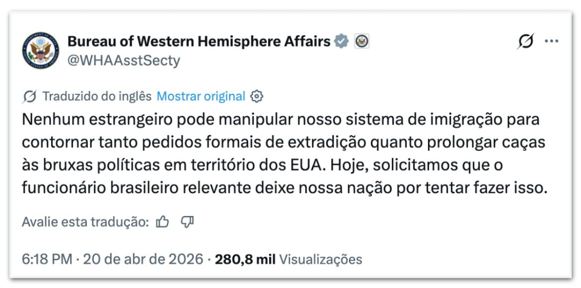 A postagem, feita pelo Escritório de Assuntos do Hemisfério Ocidental, vinculado ao Departamento de Estado, afirma que o funcionário tentou “manipular o sistema de imigração para contornar pedidos formais de imigração”.