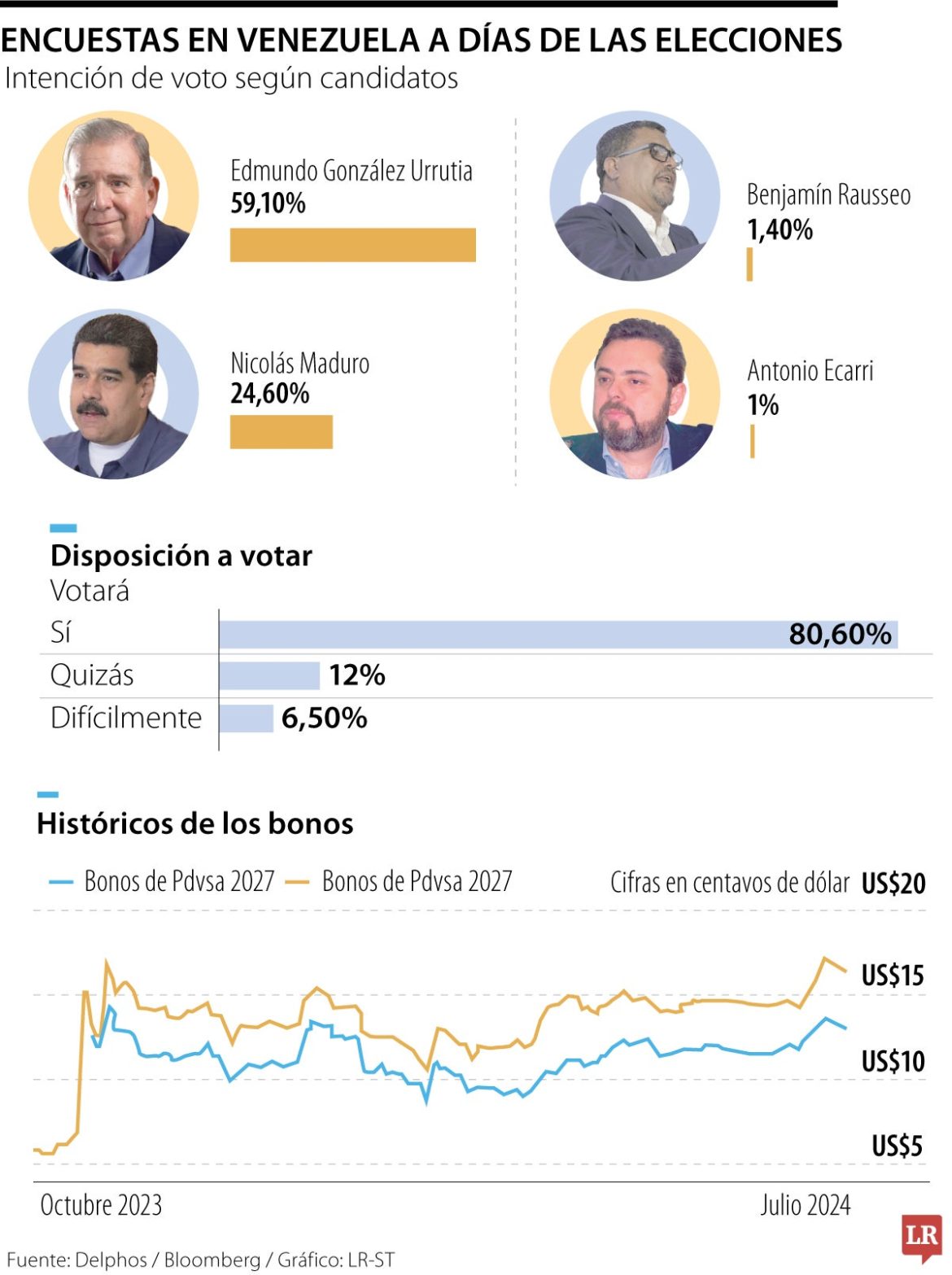 Segundo relatado pela Voz de América, em uma pesquisa da Delphos junto com o Centro de Estudos Políticos e de Governo da Universidade Católica Andrés Bello, o candidato opositor aparece com 59,1% de intenção de voto. Maduro segue com 24,6%, enquanto Benjamín Rausseo, humorista e empresário, está em terceiro com 1,4%, e o político Antonio Ecarri, do partido Lápis, ocupa a quarta posição com apenas 1%.