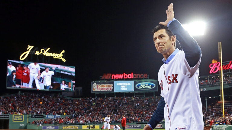 Nomar Garciaparra fazendo o primeiro arremesso antes do jogo da ALCS de 2013 entre o Red Sox e o Tigers. Jim Davis/Equipe Globe