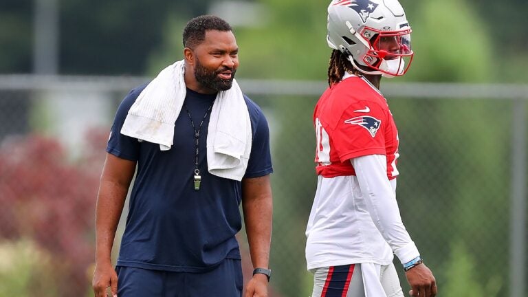 Jacoby Brissett e Drake Maye estiveram no campo direito, mais perto das arquibancadas, enquanto Bailey Zappe e Joe Milton estiveram no lado esquerdo.