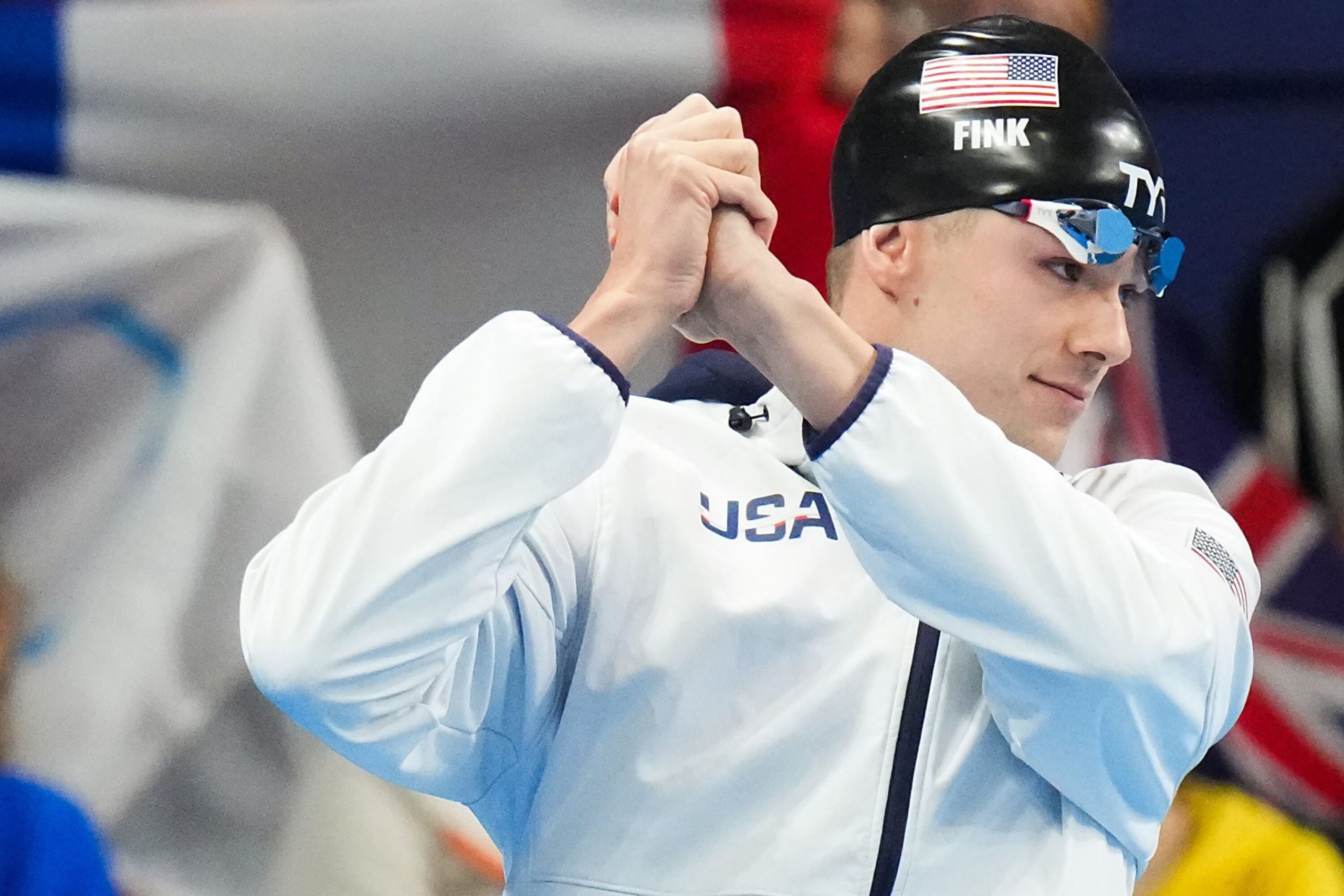 Fink, seis vezes campeão mundial, colocou a mão em cada orelha enquanto saía do túnel antes de tomar seu lugar na plataforma acima da raia seis. Ele falou sobre colocar a natação em perspectiva com suas outras prioridades de vida chegando às Olimpíadas de Paris, e parecia não ter nenhuma preocupação no mundo enquanto caminhava para o deck da piscina.