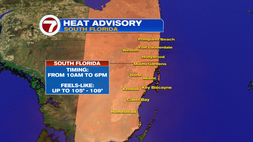 Espero que todos tenham tido um ótimo começo de fim de semana. O sul da Flórida tem enfrentado muito calor recentemente, já que o sul da Flórida tem estado sob um alerta de calor durante boa parte do mês de julho. No sábado, vimos um alerta de calor emitido mais uma vez, pois nossas temperaturas sentidas estavam bem na casa dos três dígitos por longos períodos de tempo. Esta manhã, o sul da Flórida acordou com temperaturas generalizadas na casa dos 80 e temperaturas sentidas na casa dos 90. Estava bem úmido para começar o dia. Um alerta de calor foi emitido mais uma vez para Miami e o condado de Broward até as 18h, pois as temperaturas sentidas podem chegar a 105° a 109° por um longo período de tempo.