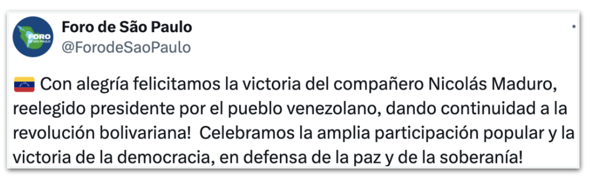 “Com alegria parabenizamos a vitória do companheiro Nicolás Maduro, presidente reeleito pelo povo venezuelano, dando continuidade à revolução bolivariana! Celebramos a ampla participação popular e a vitória da democracia, em defesa da paz e da soberania!”, afirmou no X (antigo Twitter), em tradução livre.