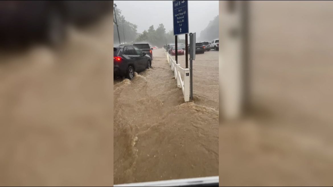 Um alerta de enchente repentina foi emitido às 17h39 para o centro do Condado de Sevier, no leste do Tennessee, que inclui Pigeon Forge, de acordo com o Serviço Nacional de Meteorologia. No momento do alerta, “entre 1,5 e 2,5 polegadas” de chuva caíram na hora anterior. Quando o alerta foi estendido às 21h33, o serviço meteorológico disse que entre 4 e 5 polegadas caíram na área de Pigeon Forge. Uma estrada local na entrada do parque desabou como resultado da chuva, disse a Polícia de Pigeon Forge.