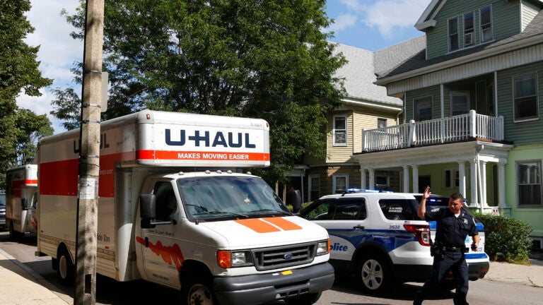 Um policial comanda a U-Hauls durante o dia da mudança de faculdade em Brighton, Massachusetts, em 1º de setembro de 2014. (Jessica Rinaldi/Equipe Globe)