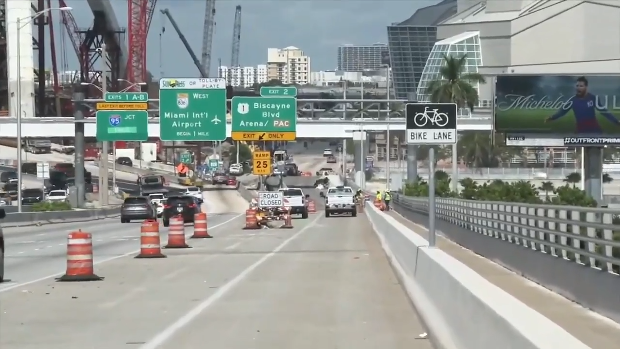 A junção na faixa da direita será removida, deixando a saída para US-1/Biscayne Boulevard mais próxima do que o normal.