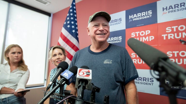 O governador Tim Walz, de Minnesota, fala com repórteres em um evento de campanha para a chapa presidencial democrata em St. Paul, Minnesota, em 27 de julho de 2024. Caroline Yang/The New York Times