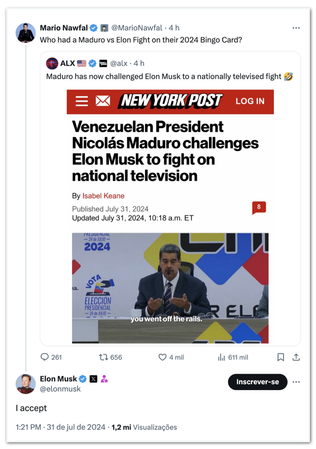Em resposta à reportagem “Presidente venezuelano Nicolás Maduro desafia Elon Musk a lutar em rede nacional”, do New York Post, Musk escreveu: “Eu aceito”.
