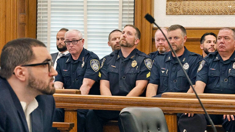 Policiais de Weymouth observam Emanuel Lopes durante o processo de sentença. Lopes foi sentenciado no Tribunal Superior de Norfolk pelo assassinato em 2018 do Sargento da Polícia de Weymouth, Michael Chesna, e da espectadora Vera Adams na quarta-feira, 31 de julho de 2024. Greg Derr/Piscina