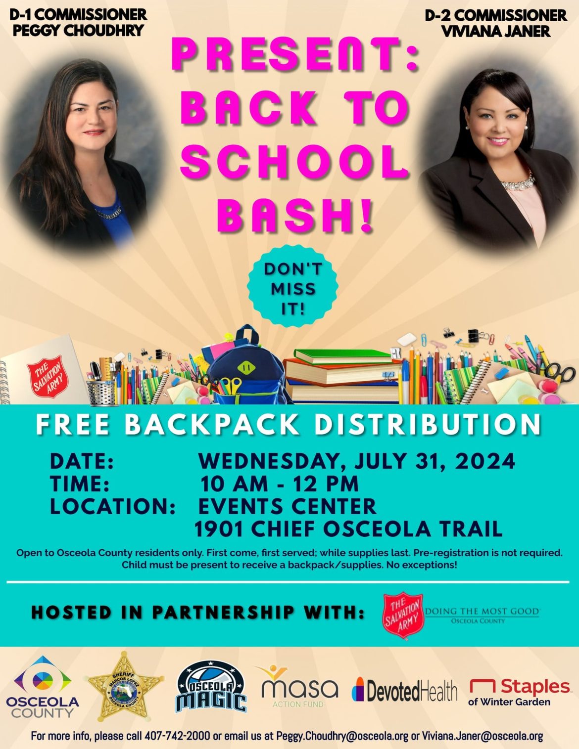 As comissárias do Condado de Osceola, Peggy Choudhry e a comissária Viviana Janer, são esperadas no evento.